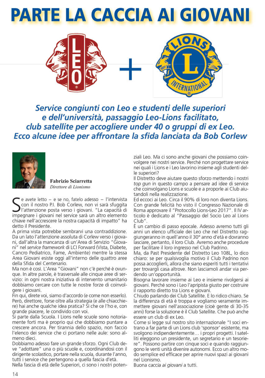 Scherzosamente, possiamo dire che i Lions, nell’anno del loro centenario, abbiano lanciato la “caccia ai giovani”.